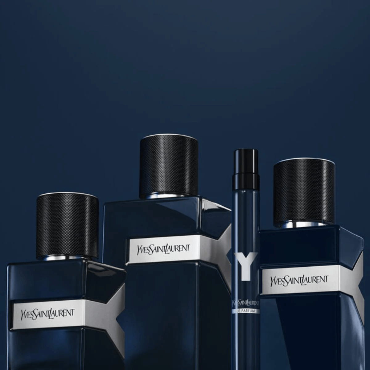 THE PITCH BLUE BOTTLE. The iconic bottle created by Suzanne Dalton for YSL takes on an intense night blue shade. Masculine and elegant, the new LE PARFUM bottle is as intense as the juice it holds. The bright silver Y slashes through the square-shouldered bottle accents the V-shaped notch in the glass – a technical feat that turns the Yconic bottle into covetable piece of design.